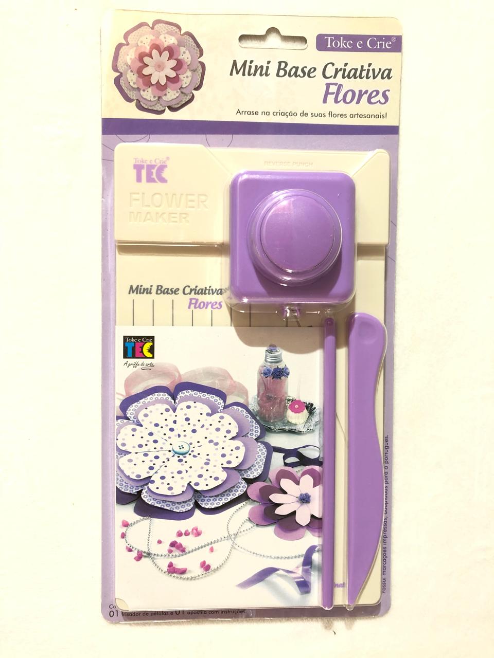 A base possui furador, espátula, frisador de pétalas, marcações guias e acompanha folder interno, com dicas e instruções de uso.